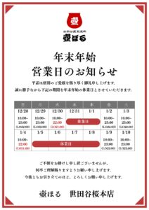 いつも壺ほるをご利用いただきありがとうございます。 年末年始の営業カレンダーをお知らせいたします📅 世田谷桜本店:12/30まで 少しずつ寒さも本格的になってきましたが、お仕事帰りの1杯や気軽な焼肉時間に、ぜひお立ち寄り […]
